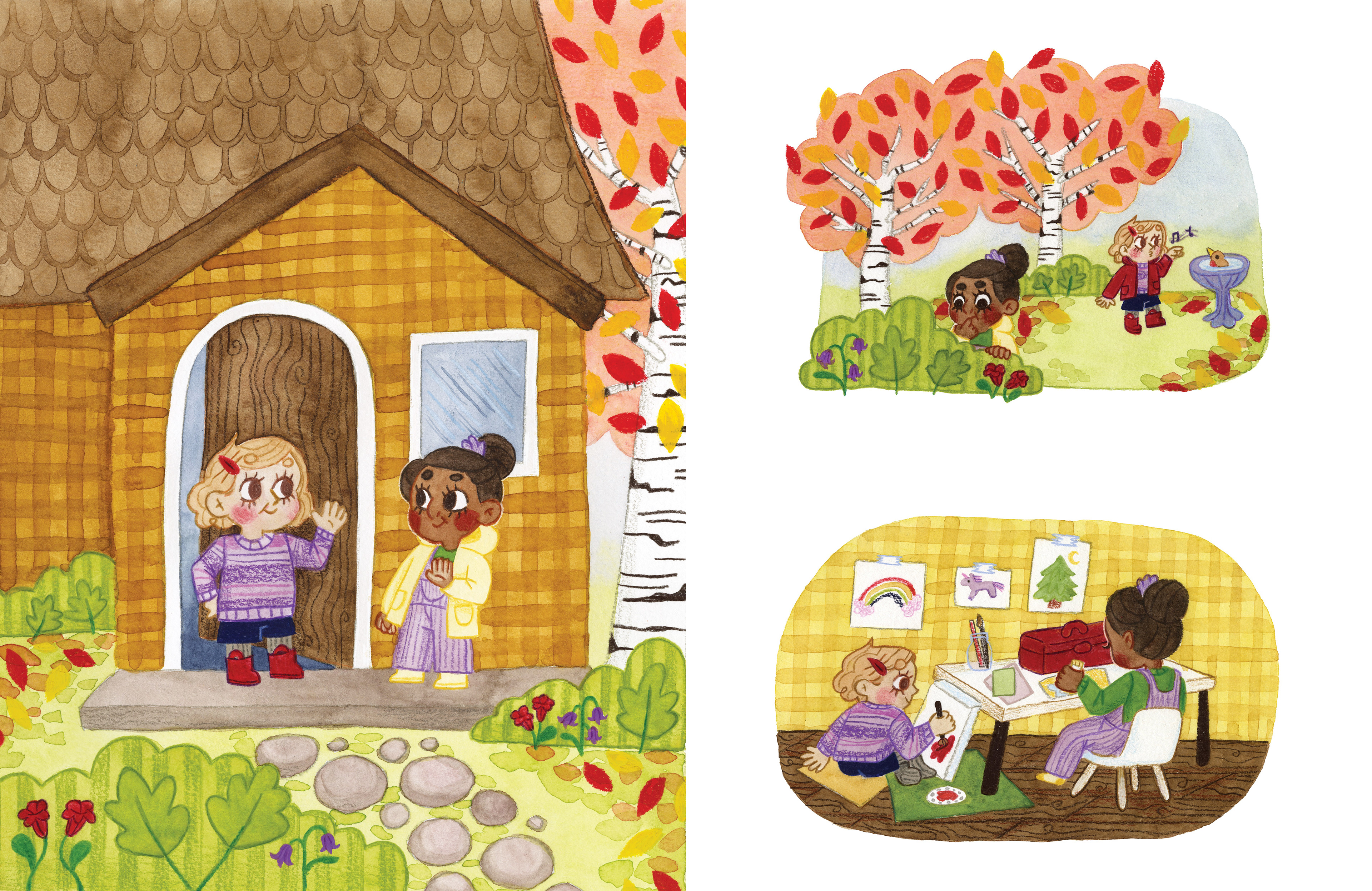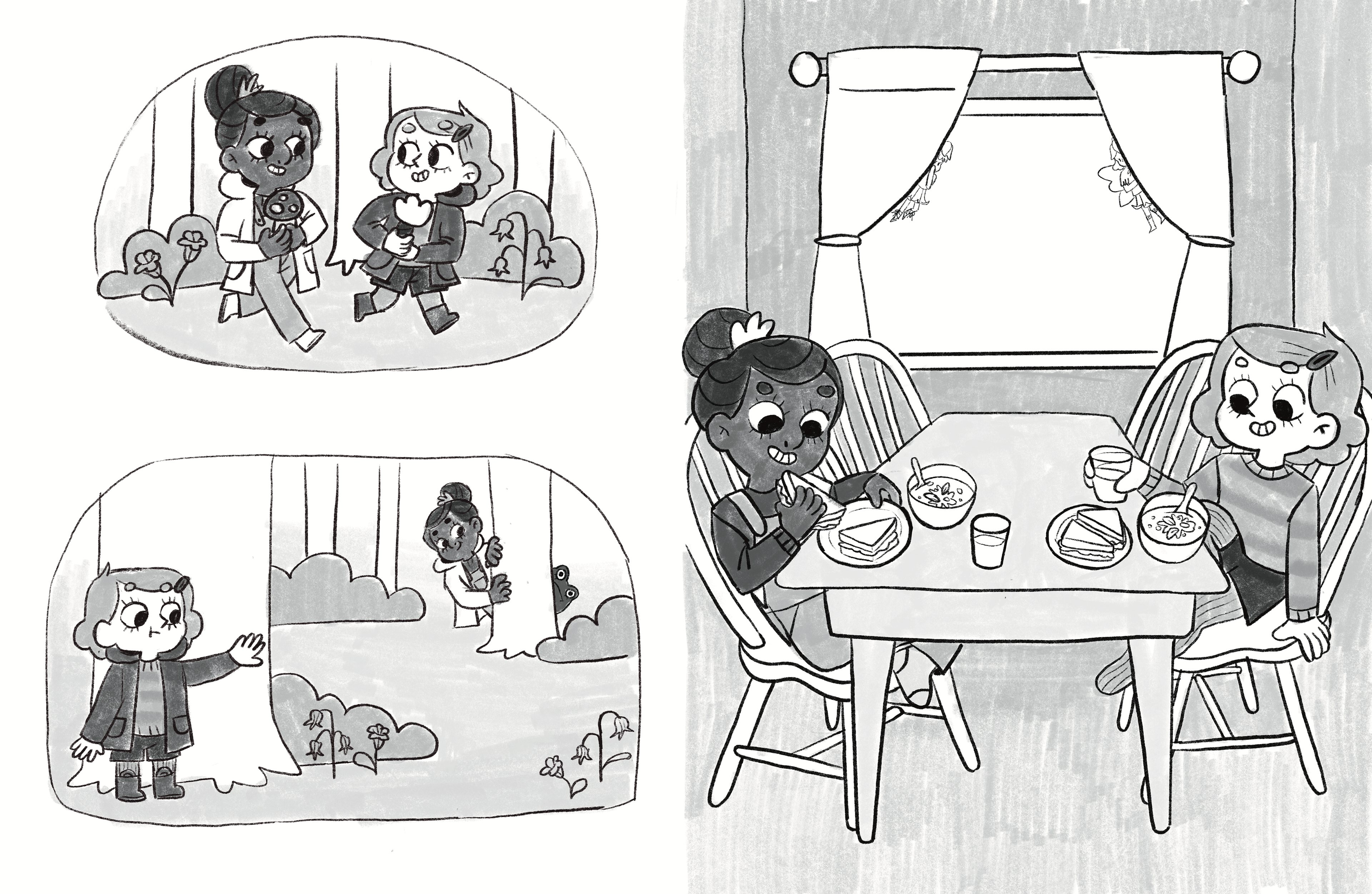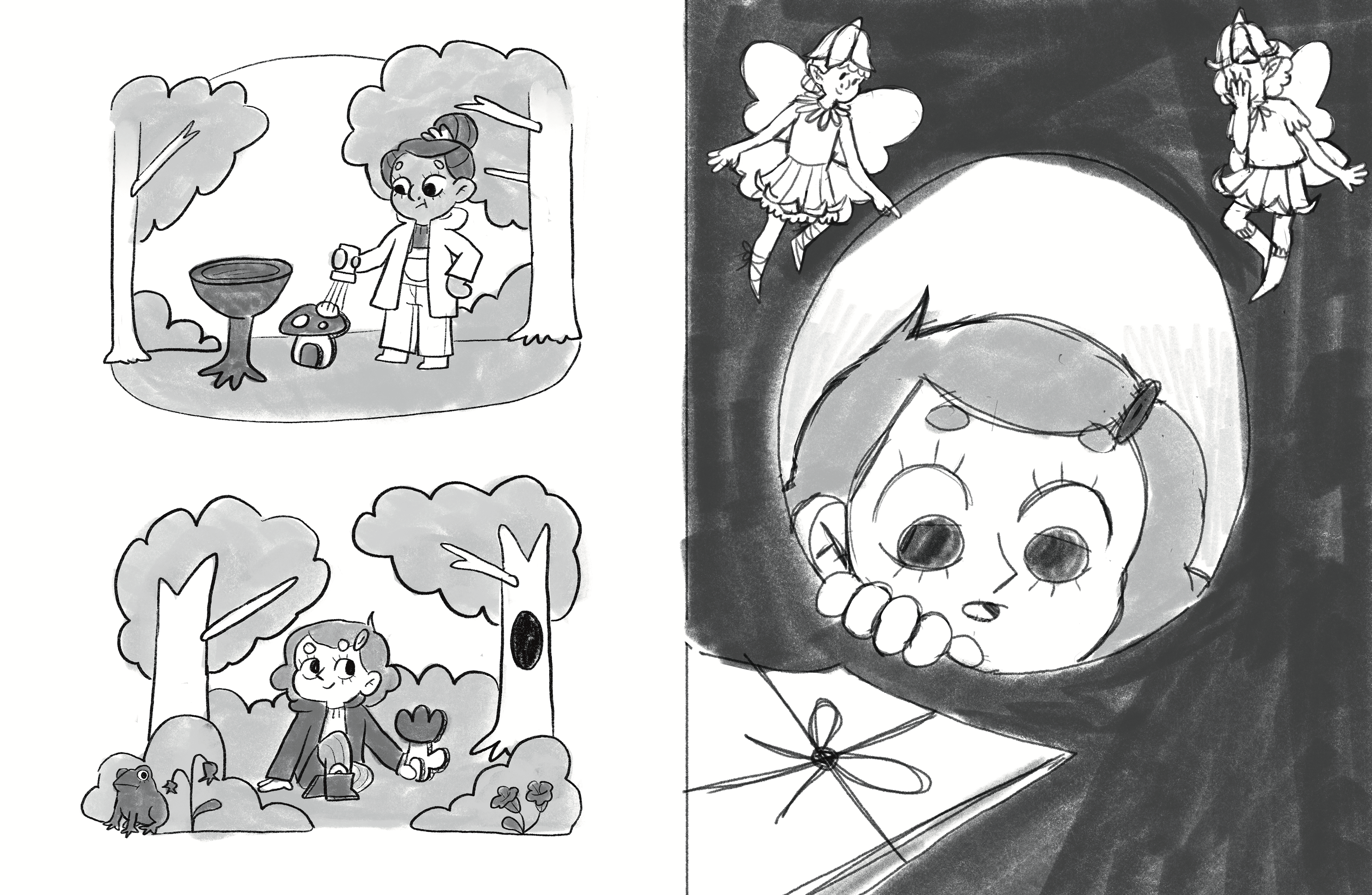 The first six pages of Megan Rowbottom's original story, which follows two young friends who search for fairies in their backyard.